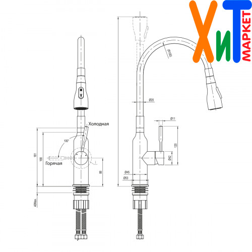 - Преимущества: удобный гибкий излив, 2-функциональный аэратор; специальный картридж, который исключает контакт рукоятки смесителя со стеной