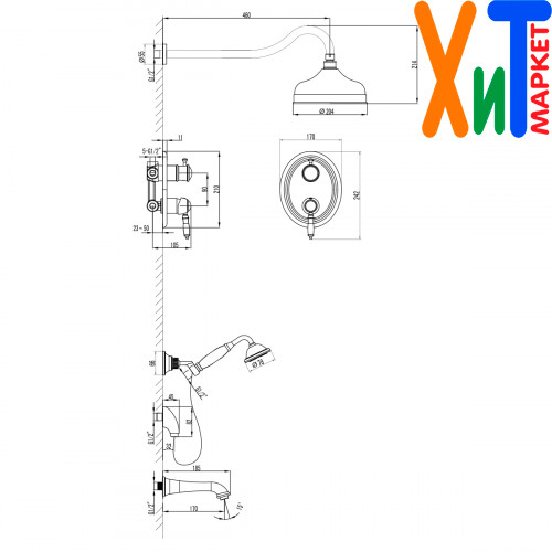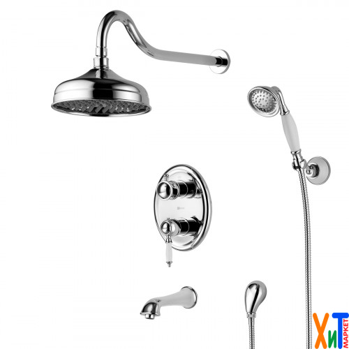 - Аксессуары в комплекте (верхняя душевая лейка «Тропический дождь» Ø204 мм, держатель верхней лейки, 1-функциональная лейка Ø78х215 мм, настенное поворотное крепление для лейки, подключение душевого шланга, душевой шланг 2 м)